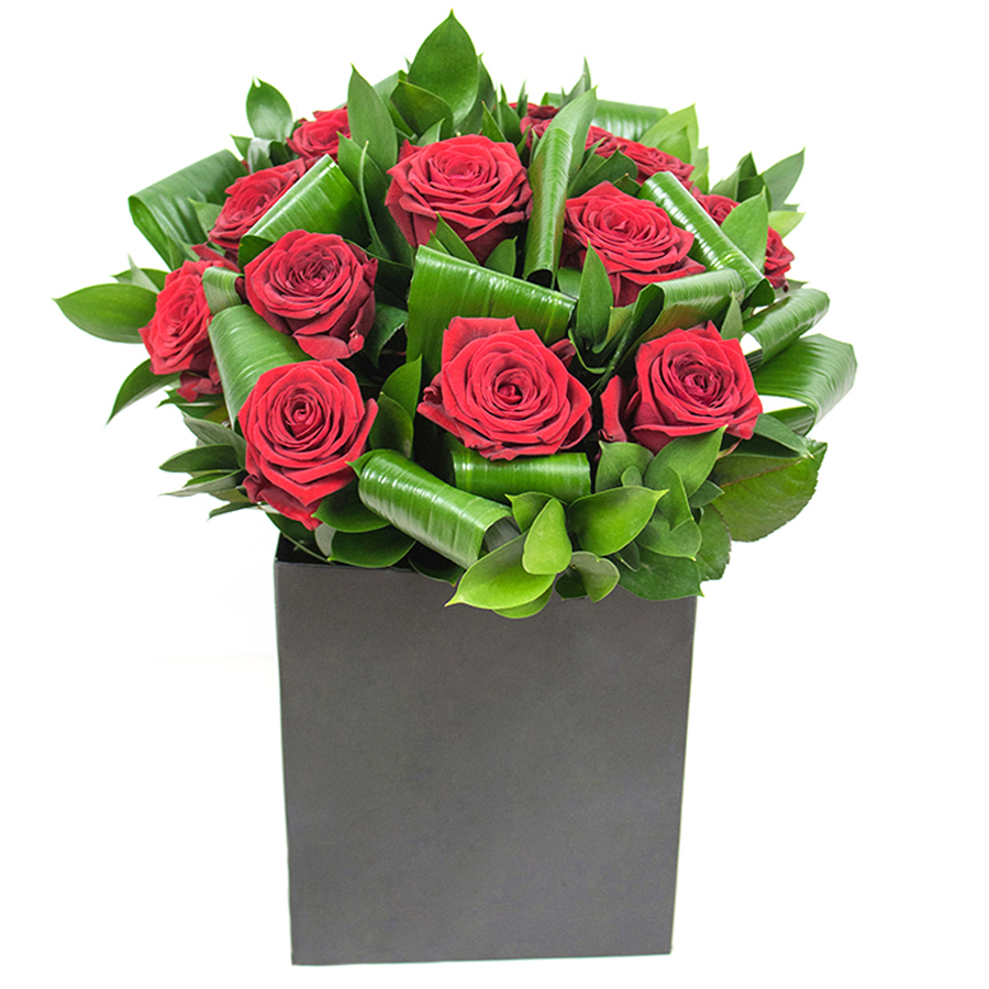 Brighten any space with our Radiant Red Roses Bouquet. This stunning arrangement features lush red roses intertwined with aspidistra leaves and ruscus, creating a vibrant and elegant display that captivates and delights.