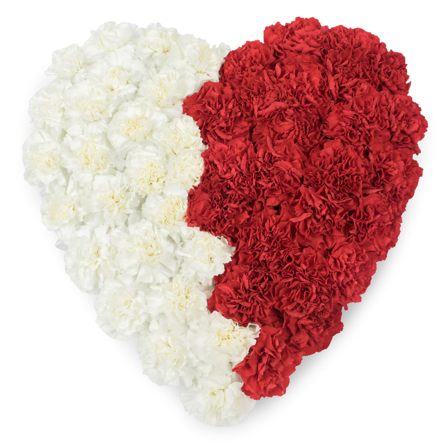 Share your heartfelt feelings with our Serene Carnations Heart bouquet, thoughtfully arranged by Handy Flowers. This elegant bouquet blends white and red carnations in a graceful heart shape, making it an ideal choice for expressing sympathy or as a meaningful gift.