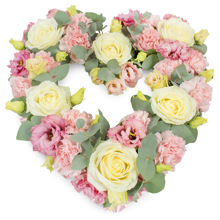 Express your heartfelt sympathy with our serene open heart floral arrangement. This beautiful bouquet includes hand-picked white roses, soft pink carnations, delicate pink lisianthus, and fragrant eucalyptus leaves, thoughtfully arranged to convey love and remembrance.